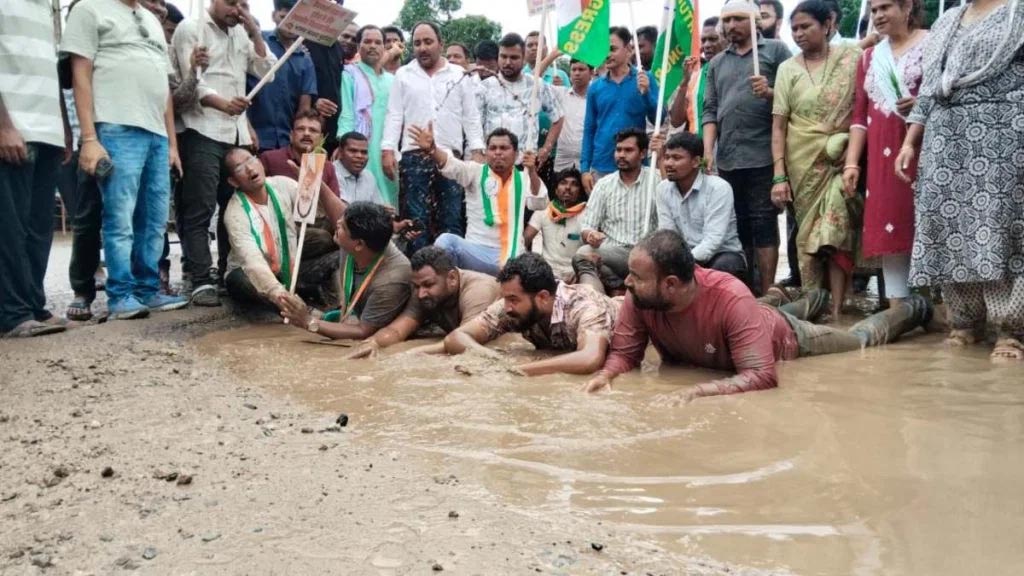बदहाल सड़कों को लेकर कांग्रेस का अनोखा विरोध प्रदर्शन: सड़क पर धान की रोपाई कर जताया आक्रोश
